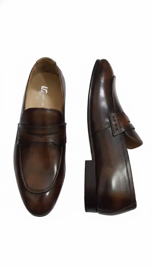A pair of refined penny loafers crafted from smooth, full-grain leather in a rich chestnut brown. Designed with a sleek silhouette, clean stitching, and a polished finish, these loafers offer timeless elegance. The leather sole and well-constructed upper provide durability and comfort, making them ideal for both formal and smart-casual wear.